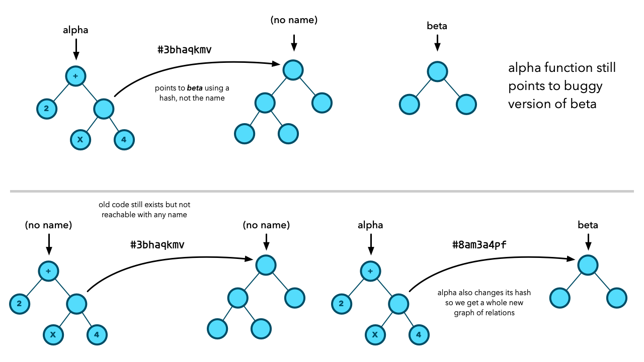 Say the alpha function and a number of other function point to beta, and it turns out that there is a bug in beta. I modify the code of beta to fix the bug. But that will produce a new function with a new hash!
