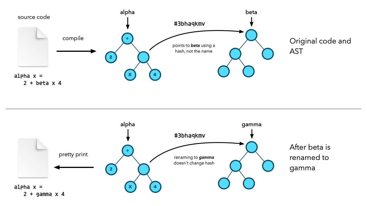 Say you write a function alpha which references a function beta you previously committed. It doesn't matter if you should later change the name of beta to gamma. The AST for alpha which you stored references beta by hash and not name. That means renaming beta to gammadoesn't invalidate that reference. You can even move beta to an entirely different namespace (package for Java developers) and it has no consequence. Your code will still run just fine. Nothing breaks.