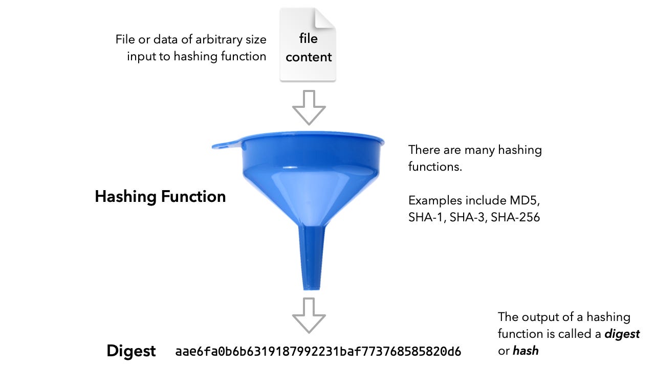 A hash function will take any data, say a file, of arbitrary size to calculate a unique number called the digest or hash based on the content. Regardless of the size of the input data, the digest that pops out is always of the same length. Git uses the SHA1 hash function to produce a digests of 120 bits (20 bytes). In principle two different files could end up with the same hash, but the probability of that is miniscule. It has been compared to picking two random locations on the Earth and picking up the same grain of sand. Unison uses SHA3 to produce a digest of 512 bits.